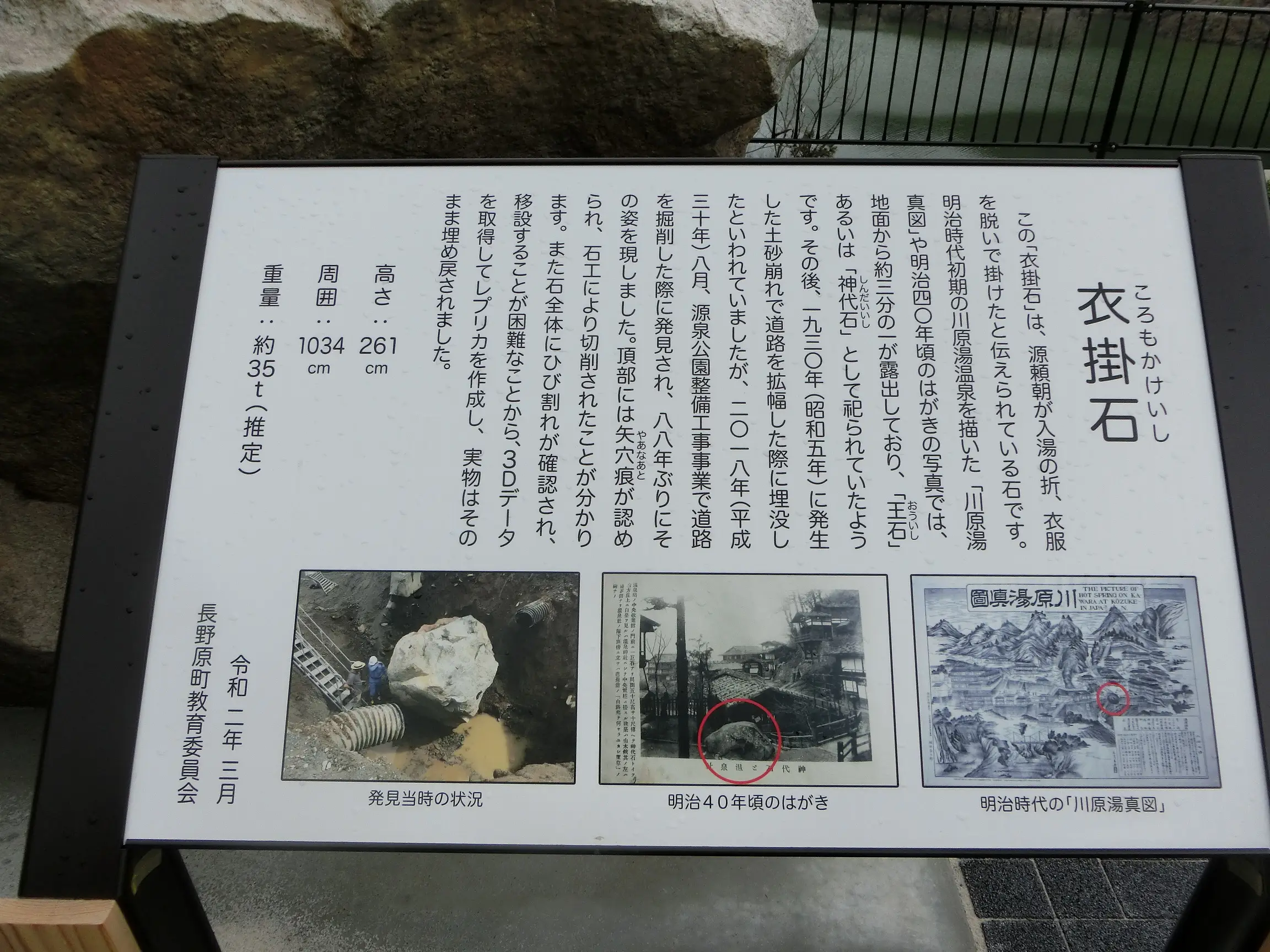 - 源頼朝が入浴するときに自らの衣を掛けたとされる伝説の岩がダム建設時に出土したが、石全体にひび割れが生じているため移設することができず、擬岩モニュメントとして復元することになりました。この擬岩モニュメントをシンボルとして伝説を語り継いでいくことができました。